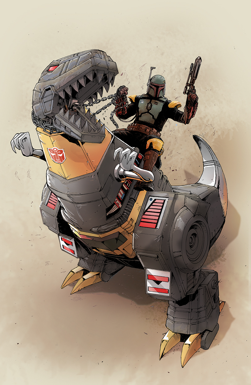 Modern Boba Fett riding Grimlock the way he rode the Rancor in Book of Boba Fett